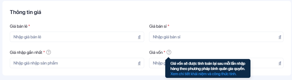 Khi Thiết lập thông tin giá khi Thêm mới sản phẩm, Giá vốn sản phẩm sẽ được tính toán lại sau mỗi lần nhập hàng theo phương pháp bình quân gia quyền.